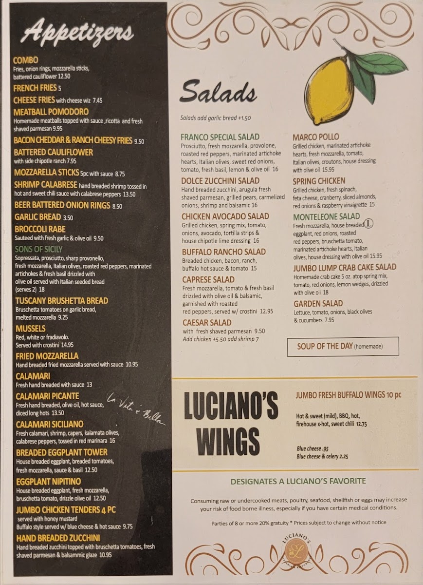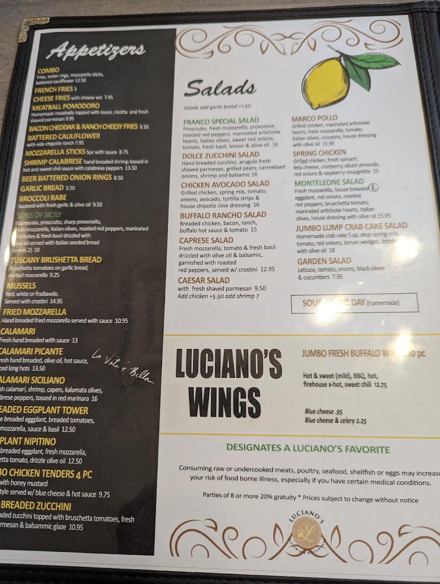 “ Luciano's is our favorite place to dine! We have ordered all different things across their extensive outstanding menu and have never had anything we didn't enjoy. Not only is the food fresh, but everything from the appitzers, sandwiches, pizza to the entrees and desserts are great. Their daily specials are inviting and appealing and are constantly changing, only adding more options aside from whats already on the menu. These things are listed on the board on the right when you walk in the door. We drive 30 minutes to eat here at least once a week. Catering... this is your place. Small private party... this is your place. Meeting friends for lunch, look no further. If you're in a rush on a weekend at prime time and have to wait, please be patient because it's worth the wait. This restaurant is a wonderful asset to the community! ”
